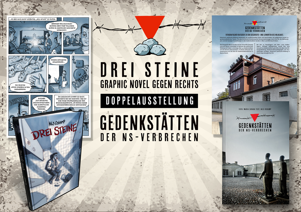 Die Ausstellung „Drei Steine“ erzählt in einer multimedialen Form die autobiografische Geschichte von Nils Oskamp über Gewalt, Zivilcourage und den Umgang mit Rechtsextremismus. Sie verbindet Graphic Novel, Lesung und politische Bildung zu einem eindringlichen Erlebnis für ein breites Publikum.